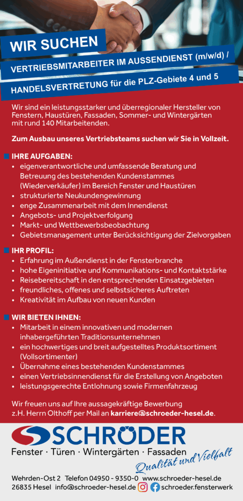 Schröder Hesel2025-10-21 11:06:012025-10-22 11:49:07Vertriebsmitarbeiter im Außendienst (m/w/d) oder Handelsvertretung für die Postleitzahlengebiete 4 und 5 gesucht